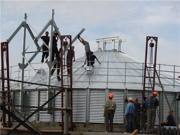 1、倉頂:由輻射狀的傘形鋼結構支撐,倉頂骨架設計采用空間結構技術,可以保證大跨度設計載荷下的穩定性,同時減小構件的尺寸。倉頂板由鍍鋅板折彎制造,包括通風窗,人孔,倉頂爬梯,倉頂護欄等 2、倉體:倉筒鍍鋅板采用國產優質鍍鋅板由倉壁板加工設備經過一系列工序加工制造,由圍板、立柱、倉門、倉門平臺、內外爬梯等配件。